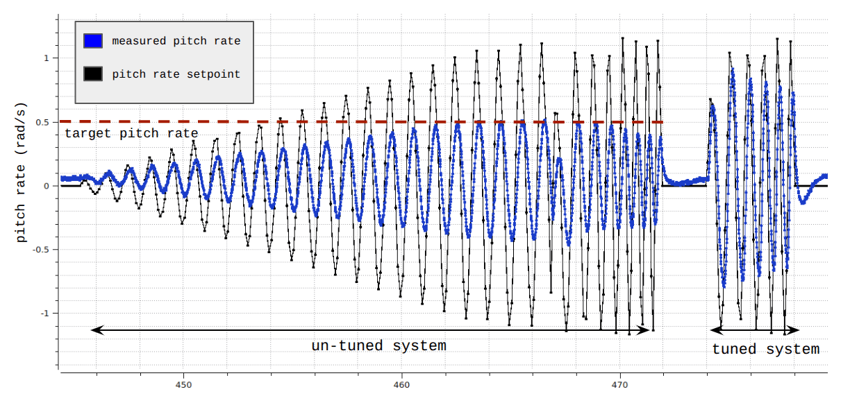 The figure below shows how steps 4 and 5 might look in flight on the pitch axis. The pitch rate gradually increases up until it reaches the target. This amplitude is then held while the signal frequency is increased. You can then see how the tuned system is able to follow the setpoint in the test signal.