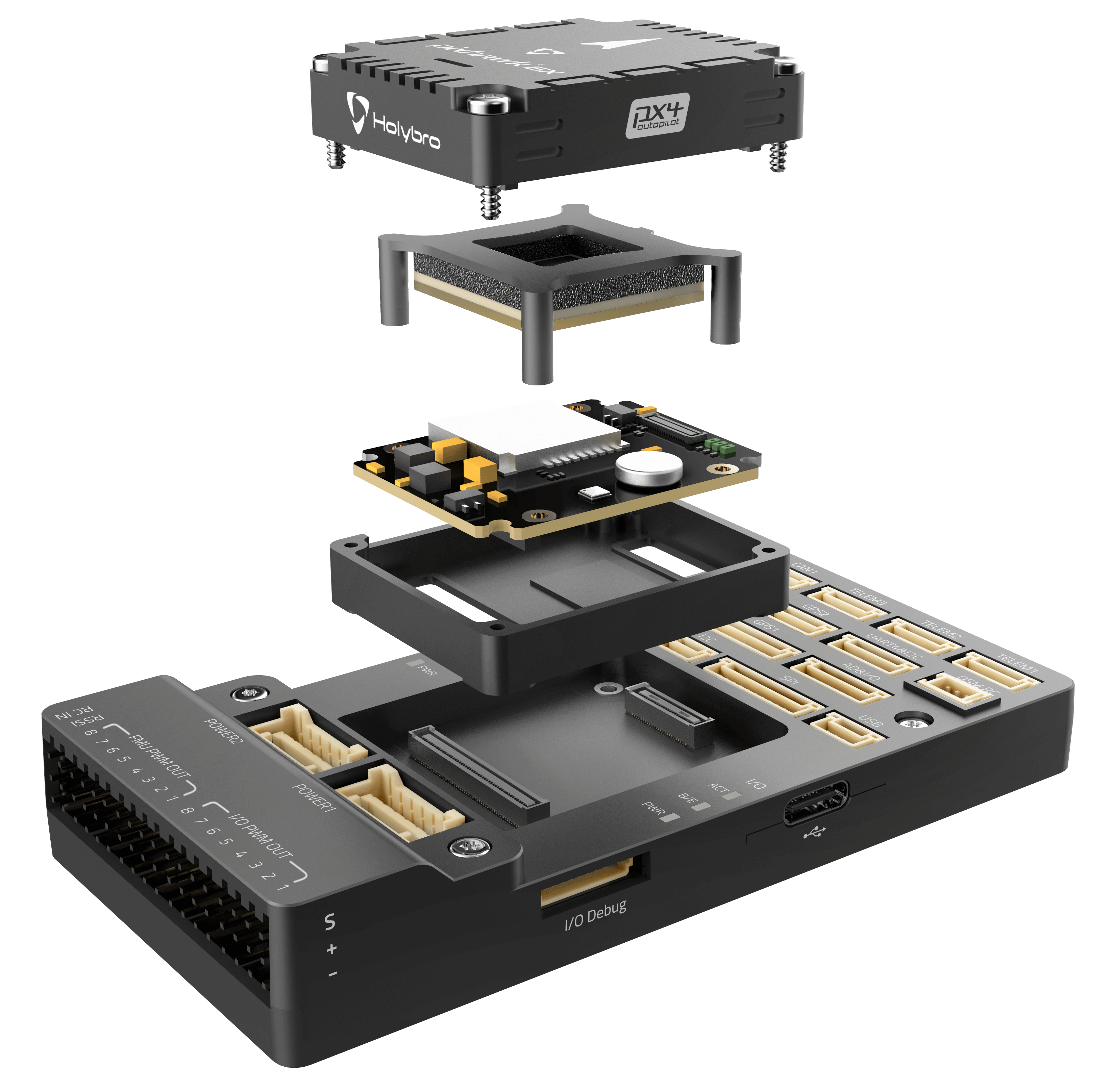 - Modular flight controller: separated IMU, FMU, and Base system connected by a 100-pin & a 50-pin Pixhawk® Autopilot Bus connector.