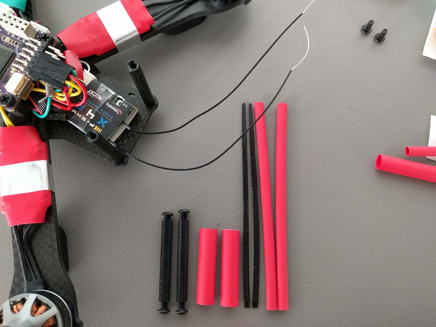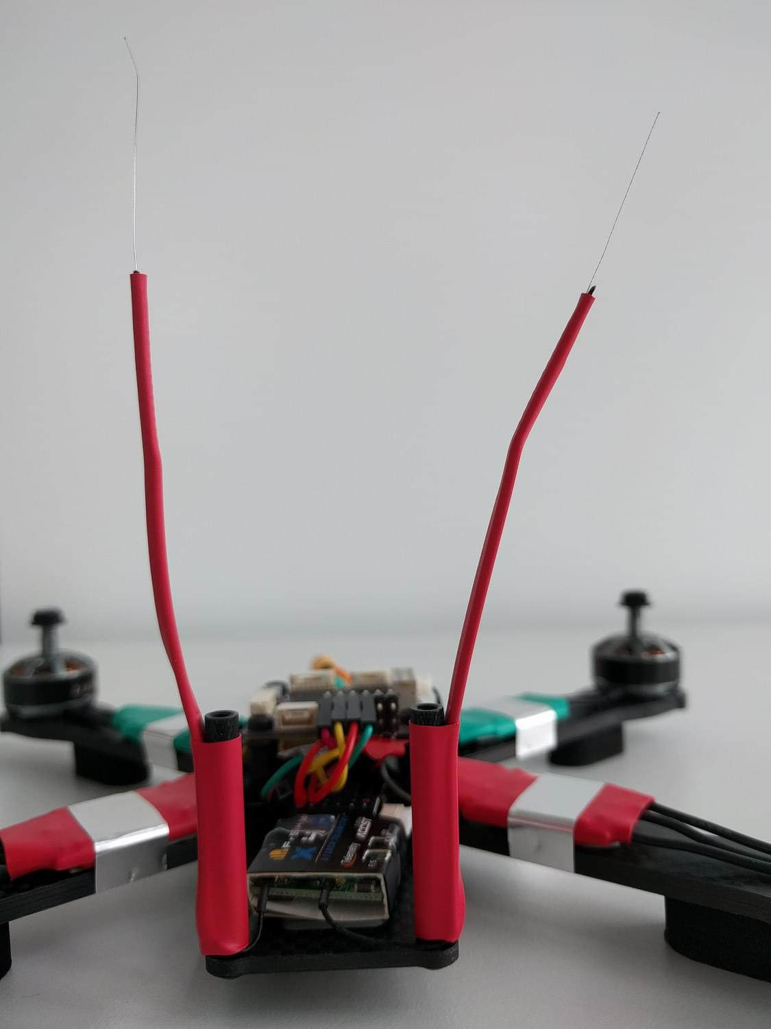 To have a good RC link while not risking to have the antenna in the props I employed a rugged mount method using heat shrinks and zip ties.