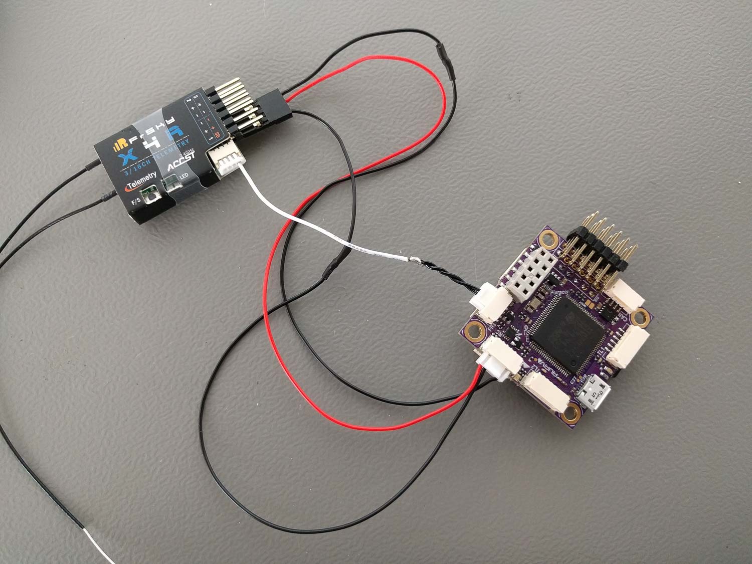 I hooked up the FrSky S-BUS receiver using the cable shipped with the Pixracer but cut away the unnecessary cable branch.